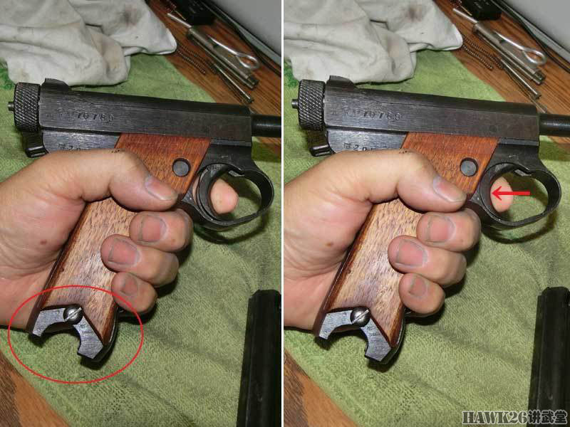 たかひろ吃惊地发现,后期型的弹匣保险不再起作用了。由于研制该枪时,日本军人普遍存在一种“拆下弹匣就安全了”的错觉,完全忽视弹膛中还有弹药的问题,因此发生了不少走火伤人的意外事件。因此大正十四年式手枪特别设计了弹匣保险,当弹匣取下后,就会锁定扳机。但这支后期型手枪的弹匣保险却失效了,依旧可以扣动扳机。