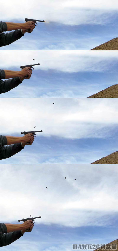 たかひろ使用经过修锉的大正十四年式手枪进行试射,从空中飞舞的四枚弹壳来看,这支手枪的射击可靠性还不错。充分说明只要装配没有问题,大正十四年式手枪的性能还是能够保证,设计方面没有大问题。