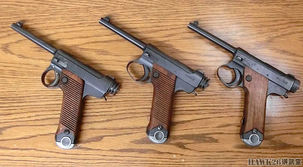 大正十一年式手枪的对比,从左至右分别为早期型、中期型、后期型,能够明显看到工艺的变化。中期型的工艺水平最好,而早期型的握把护板凹槽为25条,比中期型多一条。