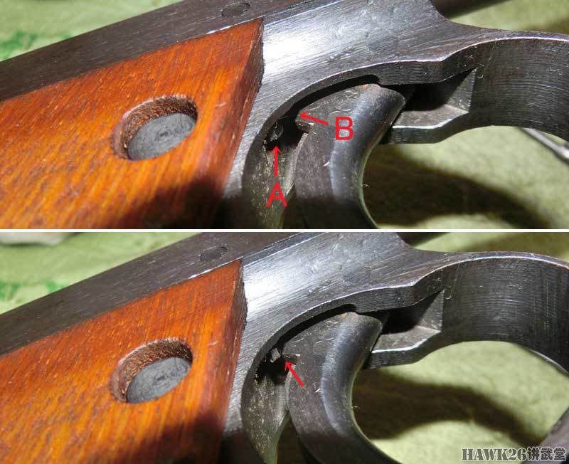 弹匣保险非常简单,取出弹匣后,弹匣保险销(A)弹出,并顶在扳机(B)的后部,使之锁定。经过测试,发现弹匣保险销太长,无法顶到扳机后部有效位置。