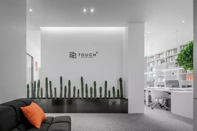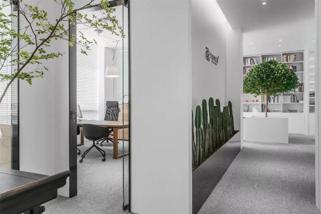 纯白的墙面,令人心情平静,仙人掌是视觉的焦点,向上生长,寓意着蓬勃发展,同时也将人的视线引向上方的品牌logo。