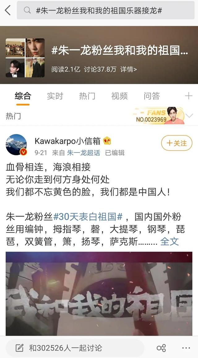 朱一龙粉丝在国庆期间自发组织线上线下30天表白祖国活动,国内国外粉丝用编钟,拇指琴,磬,大提琴,钢琴,琵琶,双簧管,箫,扬琴,萨克斯……等等超过170种乐器接龙演奏《我和我的祖国》,为庆祝祖国70周年强势应援,讨论人次高达30万多。