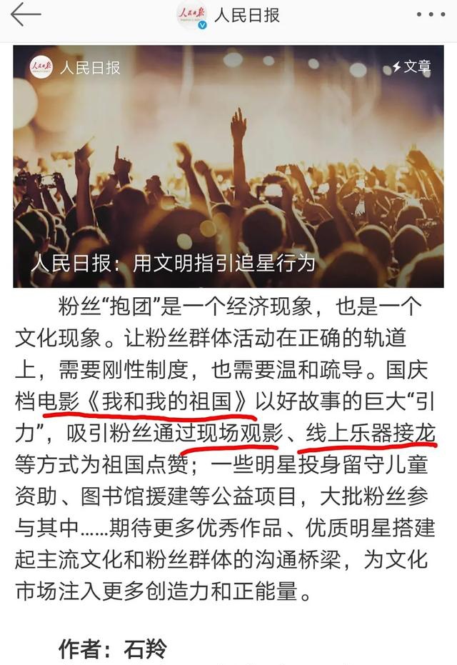 人民日报发的一篇文章中说粉丝“抱团”是一个经济现象,也是一个文化现象。点名了国庆档电影《我和我的祖国》以好故事的巨大“引力”,吸引粉丝通过现场观影、线上乐器接龙等方式为祖国点赞;一些明星投身留守儿童资助、图书馆援建等公益项目,大批粉丝参与其中的正能量群体行为,评论“谦逊、礼貌、谨言慎行、自律”等形象正在成为粉丝群体主流。