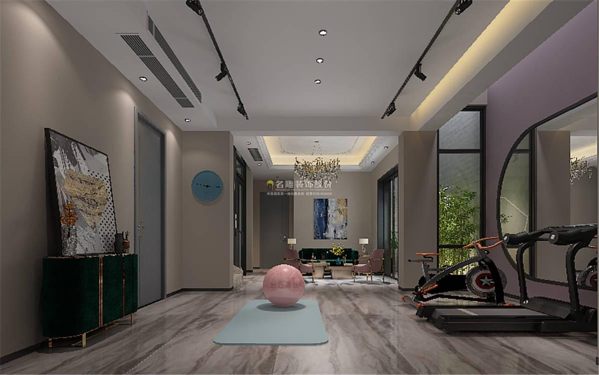 沿楼梯而下,是别墅采光极好的负一层。极简的金属发光材质线条勾勒出空间轻奢气质,玻璃的通透感引景入室,小庭院的树木近在眼前,阳光透过玻璃照进空间,身心愉悦的感受犹如身处自然。