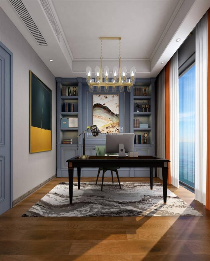 在一个书房中,桌椅、台灯、书柜,都是必不可少的,本案例选择优雅蓝的书柜和气质沉稳黑的书桌搭配,再装饰星点温暖的色调点缀,增加空间活力。实木的地板+灰色有设计感的地毯,融合一个超大的落地窗,让整个书房立马温暖舒适又时尚起来。