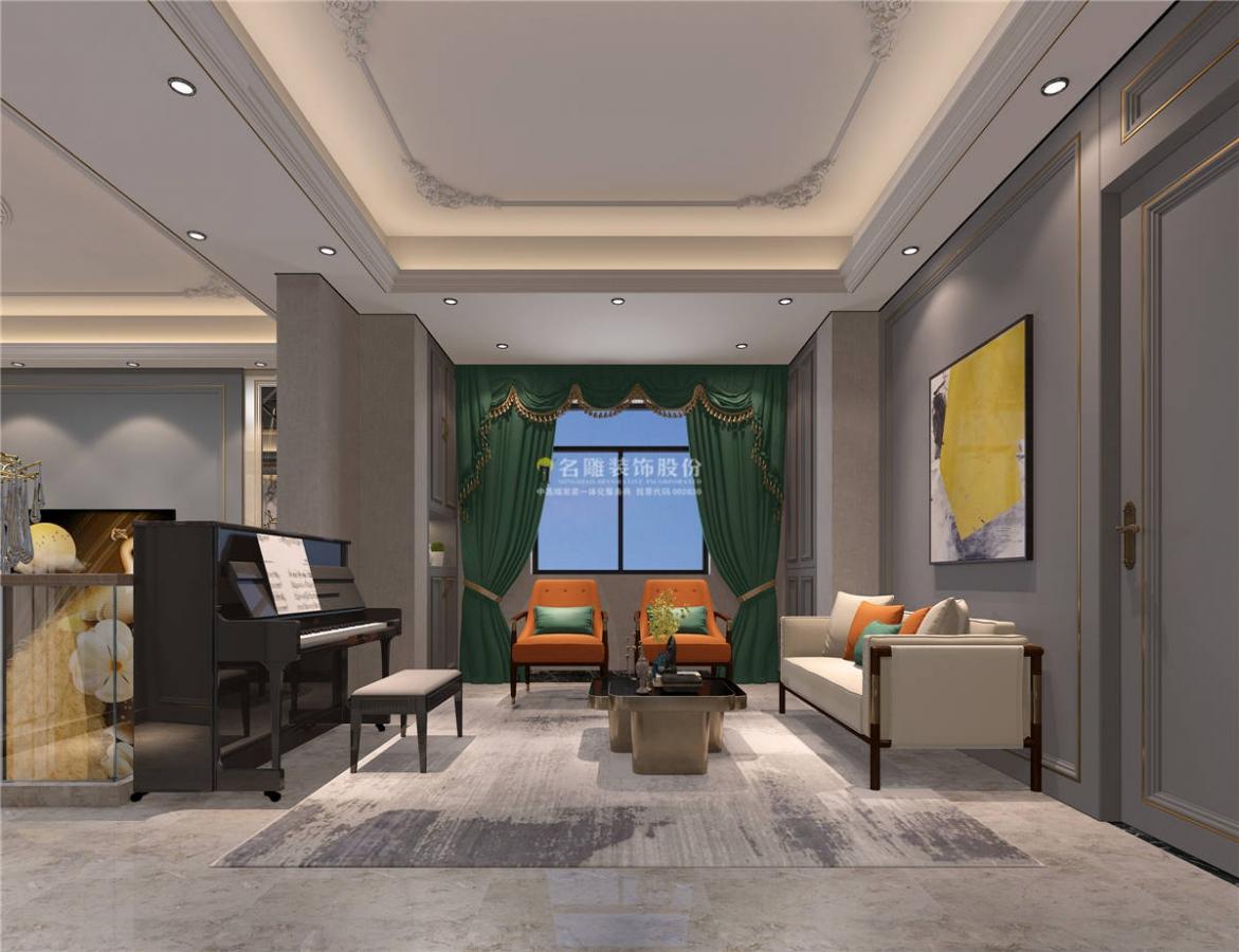 乐器是感受生活之美必不可少的陪伴,二楼休闲厅的一角是音乐的空间,钢琴旁放置的艺术品摆件也说明着房主的艺术修养。灰色钢琴椅舒适有质感,艳黄的抽象艺术墙画,窗户选择原野绿色的窗帘装饰,与沙发靠枕相呼应,营造出一副和谐的舒适美感。