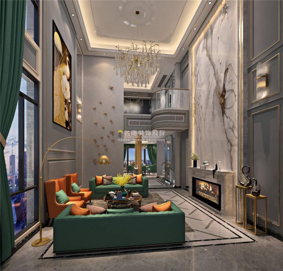 双层挑高的客厅,别致的金属蝴蝶群装饰的墙面,搭配特制的水晶吊灯,灰色与白色规则的交错铺贴方式灵动着空间。面向庭院的景观创造了家的视觉延伸效果。素色为基础的主色又点缀以优雅的祖母绿和质感橙色调的家具,让空间更有了生趣与生活的味道。