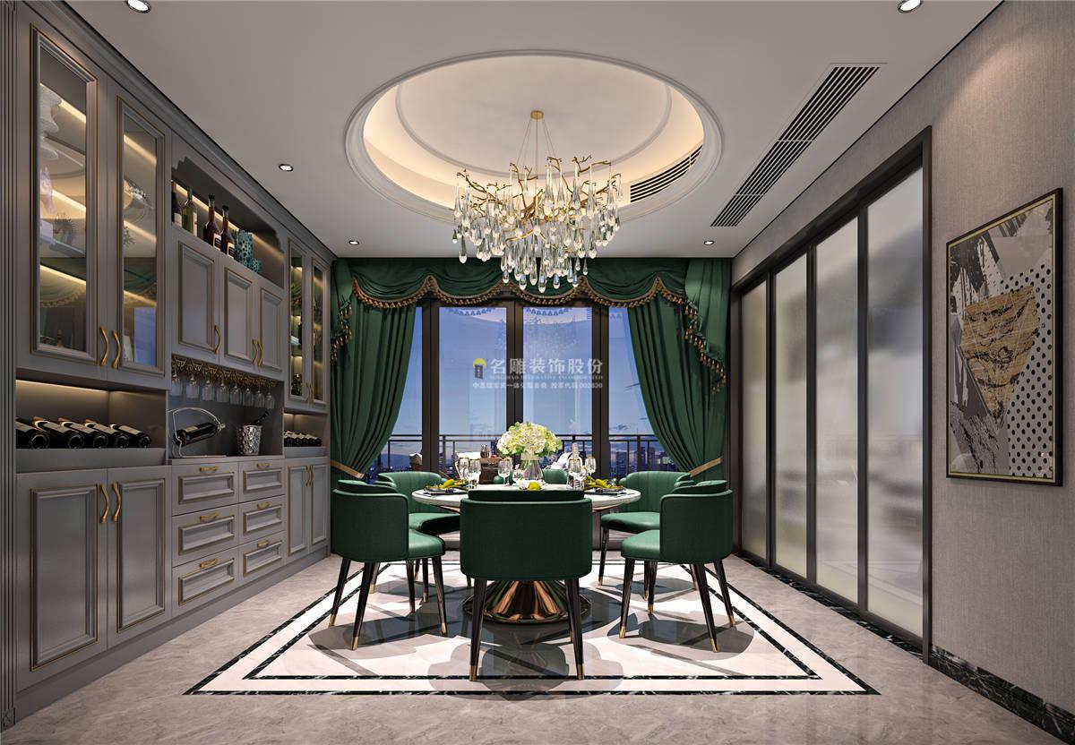 别墅餐厅以现代框架为主题,契合现代的生活方式进行功能区域划分,强调空间感和立体感,整个空间通透和大气。空间以简洁和冷淡的灰白底色为主,搭配优雅高质感的祖母绿餐桌椅和窗帘点缀,复古雅致的气息,仿佛置身于上世纪的法国。室内外景观相融合,营造一种感性、超然的生活样式浮现眼前,自由惬意。