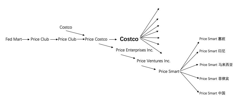 通过这个图大家应该看明白了,最早是从Sol Price创立的Fed Mart起源的,后来Price Club高管辛尼格跳槽出来与人合伙创立了Costco,再后来与Price Club合并为Price Costco,后又分家独立为Costco,分离出去的PEI先分出PVI又创立了PriceSmart品牌,这才有了各国的“普马”,中国普马只是其中之一,也是得到支持最小的一支。