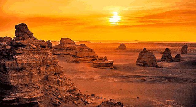 大自然精雕细镂的雅丹,千姿百态,变幻万千,气势磅礴,很是壮观。清晨,登高远眺,点点朝霞,金光四射,气象万千;傍晚,巨大的红日悠悠西沉,身边徐徐清风,头顶霞光灿烂。堪称自然的馈赠。