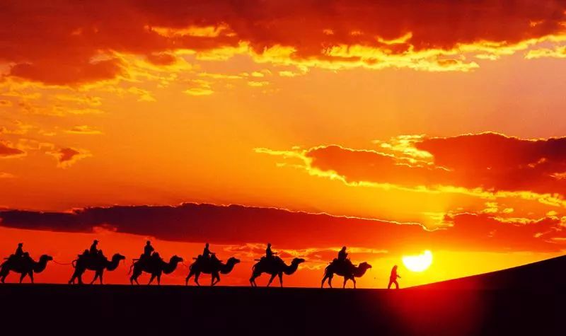 在茫茫的沙漠中,鸣沙山怀抱一汪清泉,一弯新月,灵动而精美。绵延起伏的沙丘就像大海一样浩淼无边,泛着黄色的沙丘,就像大海中一个个浪花,形态各异。在夕阳下,山脊挺括,宛如刀刃,一道道沙脊呈波纹状,明暗相间,层次分明。一座座像古埃及金字塔,金碧辉煌,巍峨壮观。
