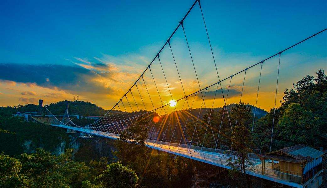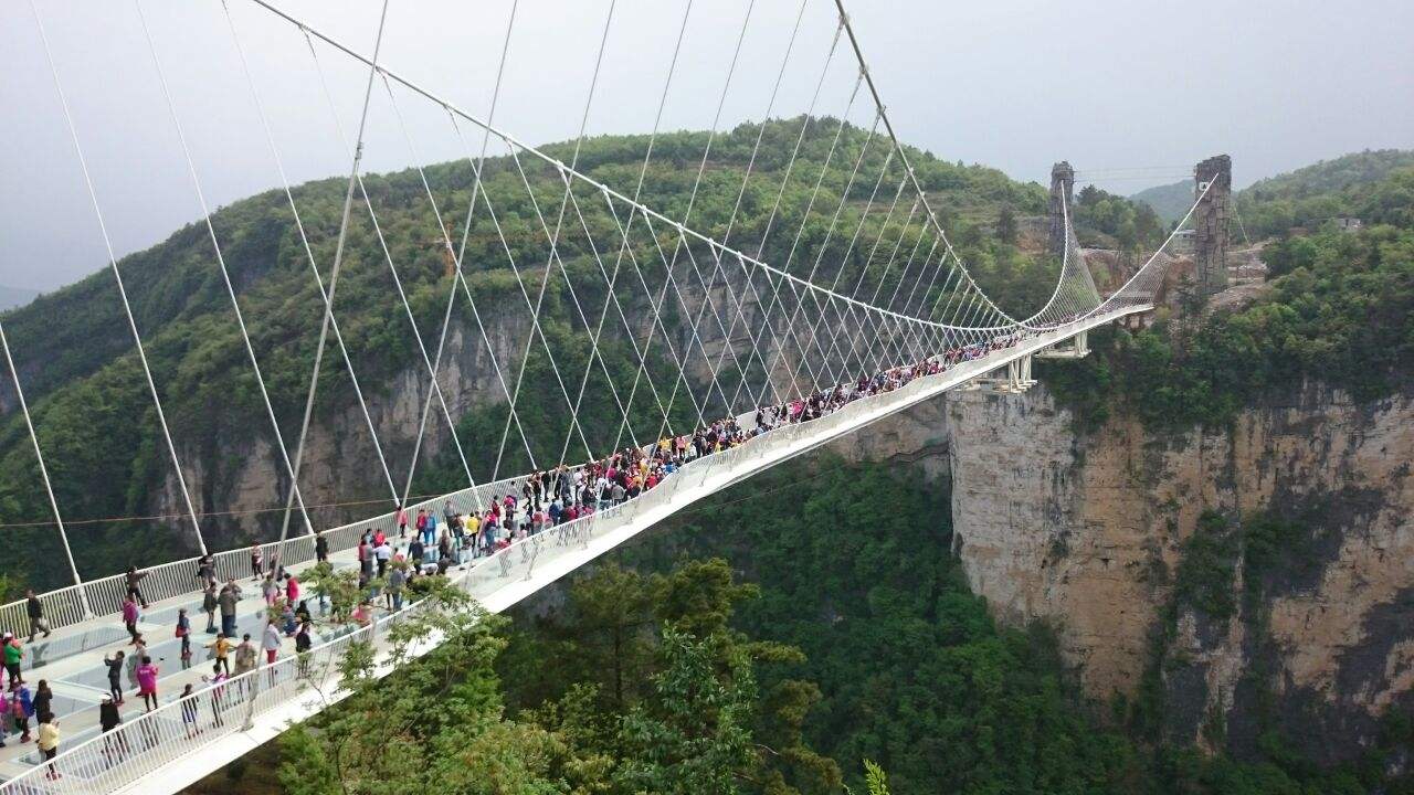 张家界大峡谷玻璃桥名“云天渡”,位于湖南省张家界大峡谷景区栗树垭和吴王坡区域内,是一座景观桥梁,兼具景区行人通行、游览、蹦极、溜索、T台等功能。主跨430米,一跨过峡谷,桥面长375米,宽6米,桥面距谷底相对高度约300米。