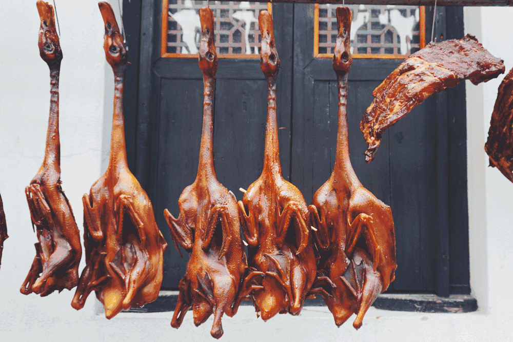 绍兴有“三缸”:酒缸、染缸和酱缸。旧时的绍兴人,不一定家家户户有三缸,但一定会有酱货。绍兴的酱菜中,以酱鸭最受欢迎。鸭子先腌后酱,成品色泽栗子红色,油润咸香,让人回味,美味至极。