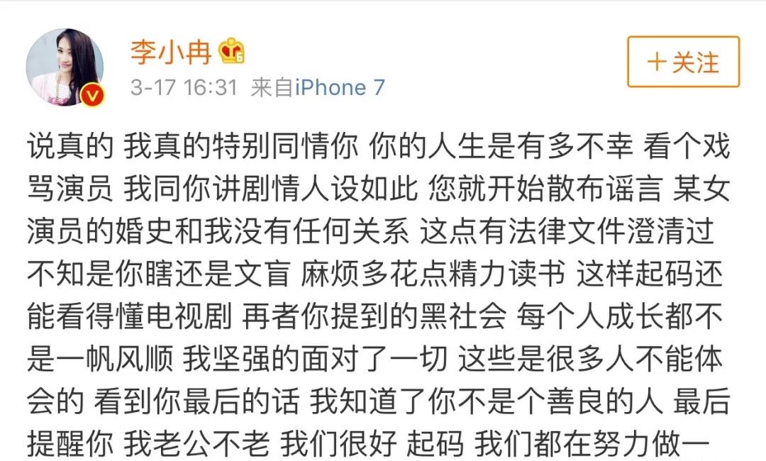 去年,李小冉再度因为小三评论发声,当时有网友阴阳怪气的DISS她。