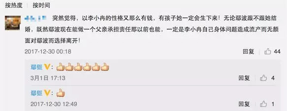 结果他暗戳戳的回复了几个力挺他的评论,特别是时隔三个月,两次点赞一个说 李小冉流产是她自己的问题 的评论。