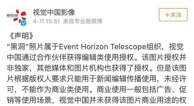 这张照片理应属于全人类,并没有版权,只要标明来源,任何人都可以使用。但随之而来的是“视觉中国”公司的所谓版权声明,该公司宣称其拥有黑洞照片的版权。