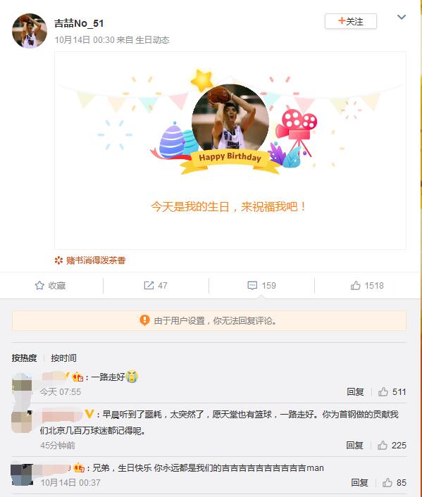 新京报讯 今日,据前CBA球员焦健透露,北京首钢男篮队员吉喆因病去世。吉喆出生于1986年,今年10月14日,刚刚度过33岁的生日。吉喆曾随北京首钢队三次获得CBA联赛总冠军。在他去世的消息传出后,球迷纷纷在他的微博下留言。有球迷写道:“早晨听到了噩耗,太突然了,愿天堂也有篮球,一路走好。你为首钢做的贡献我们北京几百万球迷都记得呢。 ”