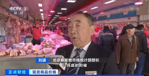 北京新发地市场统计部部长 刘通:11月底的时候,新发地市场白条猪批发的平均价钱是17.25元一市斤,但是10月初的时候,是23.63元一市斤,月末和月初相比,已经下降了27%。(央视记者 王小节)