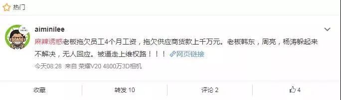 此外,麻辣诱惑还出现了拖欠员工工资和供应商货款的情况。麻辣诱惑员工透露:“目前有三个月没有收到工资,很多人已经申请了劳动仲裁”。