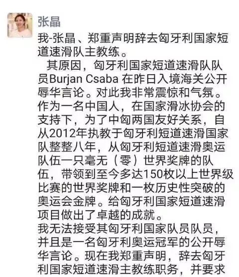“作为一名中国人,在国家滑冰协会的支持下,为了中匈两国友好关系,自从2012年执教匈牙利短道速滑国家队整整八年,从匈牙利短道速滑奥运队伍一直毫无(零)世界奖牌的队伍,带领到至今多达150枚以上世界级比赛的世界奖牌和一枚历史性突破的奥运会金牌,给匈牙利国家短道速滑项目做出了卓越的成就。”张晶称无法接受匈牙利国家队队员的公开辱华言论,“现在我郑重声明,辞去匈牙利国家短道速滑主教练职务,并要求匈牙利国家滑冰协会公开道歉。”
