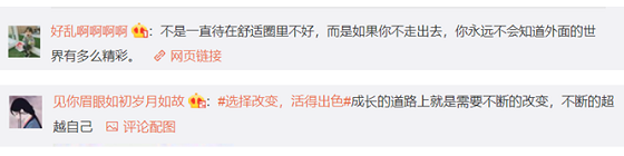 网友@好乱啊啊啊啊就表示“不是一直待在舒适圈里不好,而是如果你不走出去,你永远不会知道外面的世界有多么精彩”,网友@见你眉眼如初岁月如故也发表自己的观点:“成长的道路上就是需要不断的改变,不断的超越自己”。