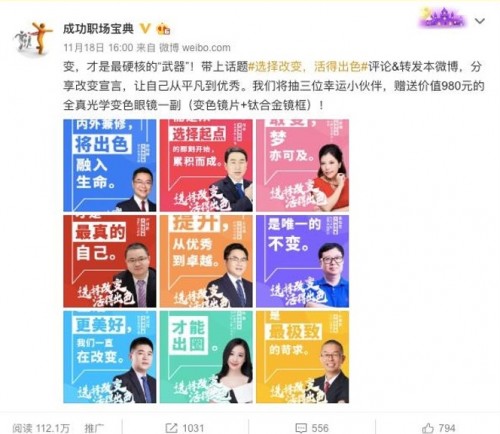 在成功职场宝典、成功职场、创业最前线等职场类微博大号的助推下,全真光学#选择改变,活得出色#的微博互动话题撬动了近500万人次的关注,让消费者在互动中增强对变色镜片的认可。