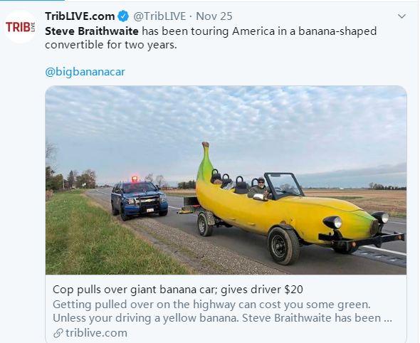 中新网12月6日电 据外媒报道,以手工打造“香蕉车”而声名大噪的斯蒂文·布雷思韦特(Steve Braithwaite),目前正在进行他环游全美50州的计划。前段时间,他在驾驶时遇到警方检查,却意外收到警察的友情赞助,让他喜出望外。