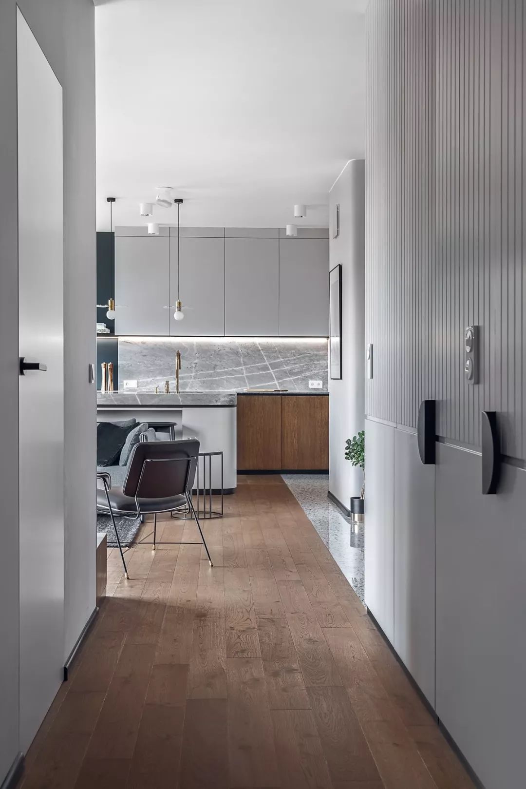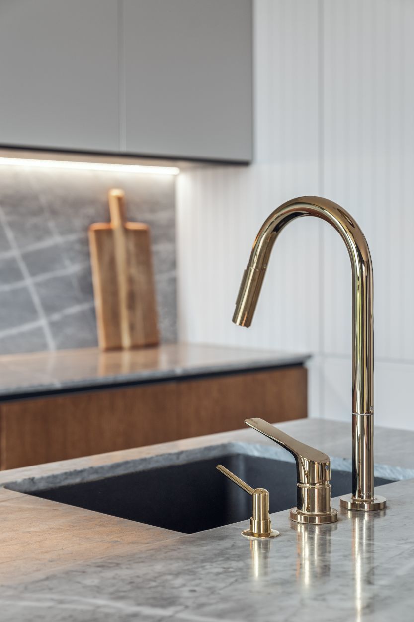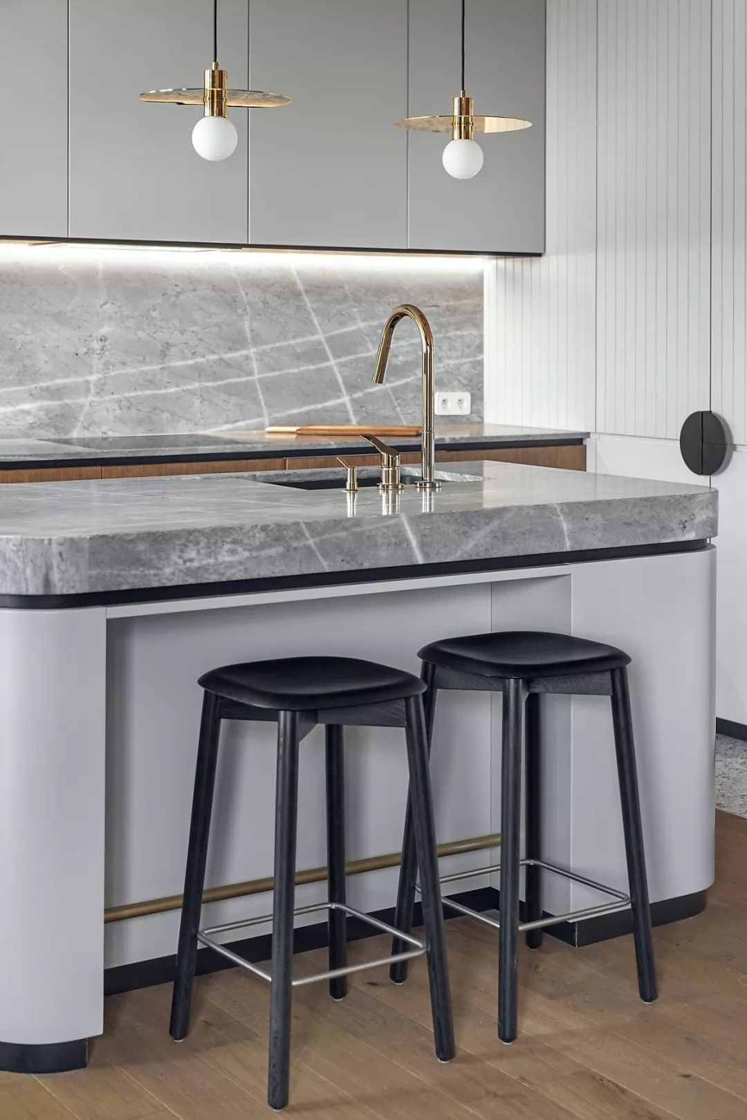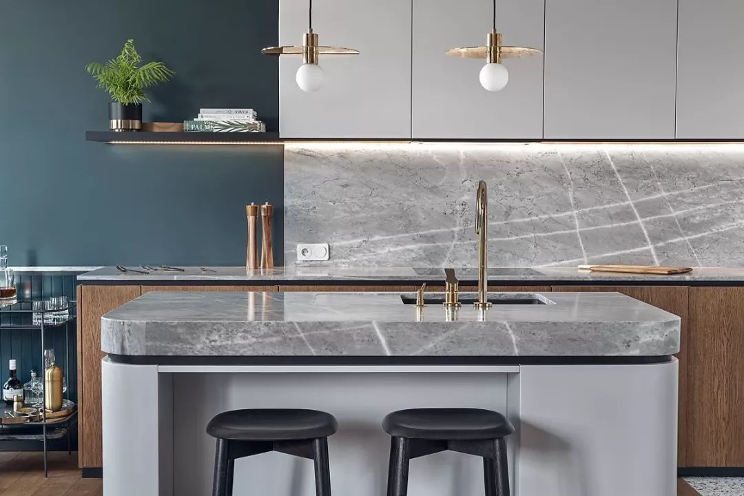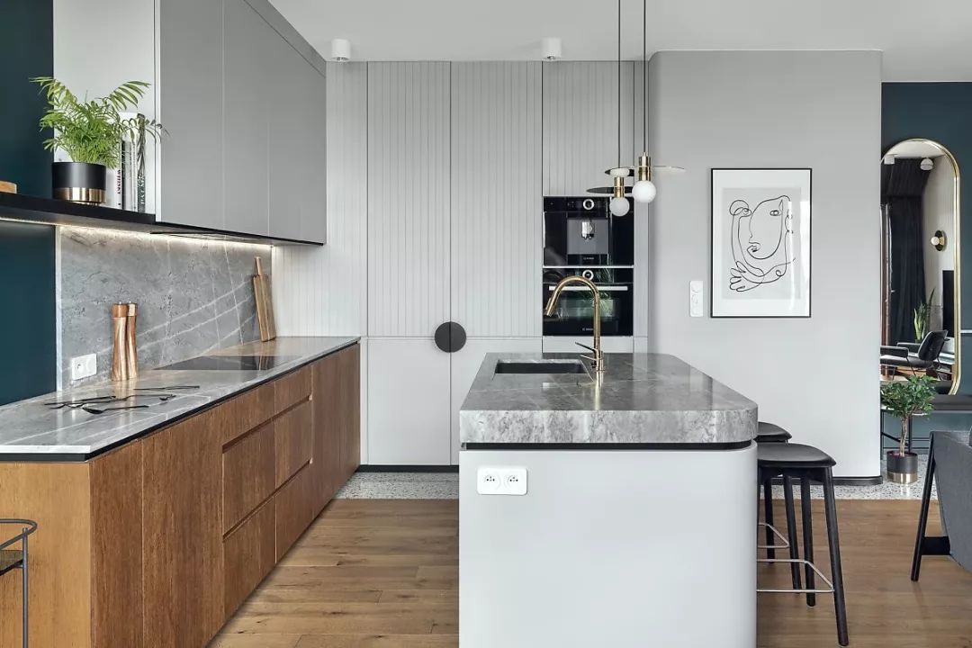 开放式的厨房以浅灰色为界线划分底部原木色的厨柜门与木地板相呼应大理石台面、金色水龙头看起来质感十足。
