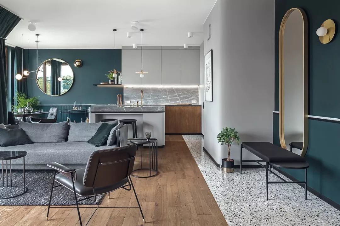 水磨石铺贴的地面从玄关处延伸到厨房位置墙面90cm 高的位置还嵌入大理石条装饰。