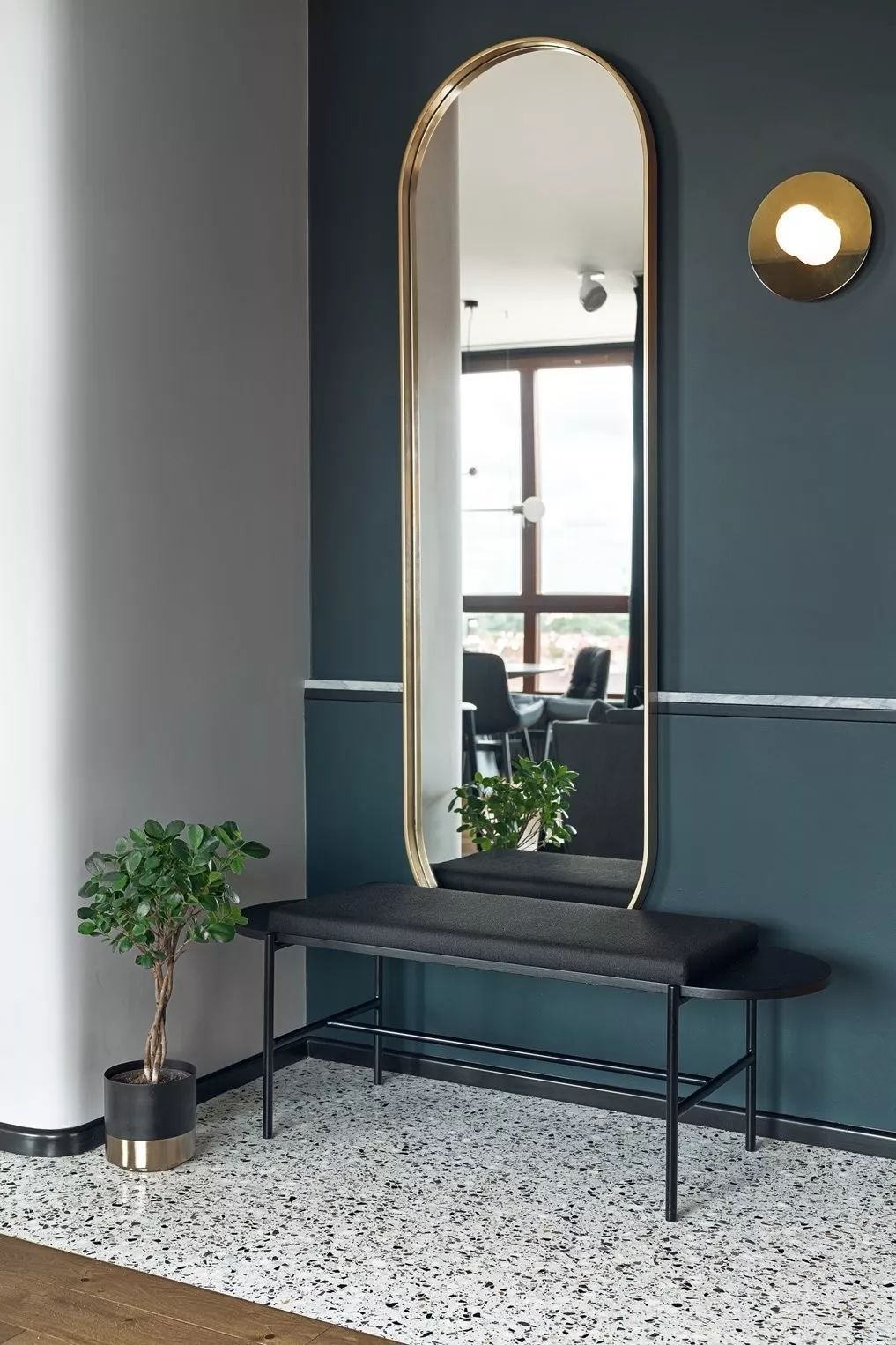 金色边框别致造型的穿衣镜、壁灯搭配黑色的换鞋凳,造型简洁流畅,充满时尚感
