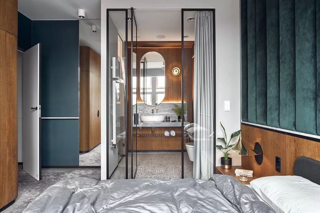 使用玻璃门内部加入灰色的帘子保证私密性的同时也增加了卫生间的采光。