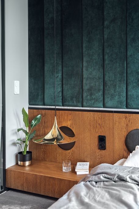 卧室有一个斜屋顶软包的墙面与木质护墙板相拼接隔音效果极强再配上金色的灯具加重了温馨、奢华感。