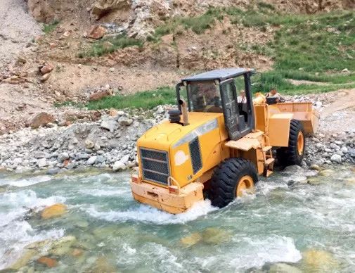 无限风光在险峰,美玉多是深山来。塔什库尔干塔吉克自治县(简称“塔县”)是新疆喀什地区下辖县,地处帕米尔高原西部,距喀什市298公里,与巴基斯坦、阿富汗、塔吉克斯坦三国接壤。“塔玉”矿区在大同乡,沿途山体海拔较高,途中所见多是壮美荒凉的开阔山景。南疆地区日照时间长,气候干旱少雨,土壤多是裸露,汽车一旦开过很容易扬沙。骆驼刺、沙棘和胡杨是这里较为常见的植物。在我们进入矿区的路上,从半山腰向下俯瞰,可见山路蜿蜒盘旋。为一探“塔玉”之美,团队成员跋山涉水,不畏辛苦——面对拦路虎般湍急开阔的河流时,大家借助挖掘机巧妙化解危机。从塔县开车约4-5小时后,我们终于抵达目的地。