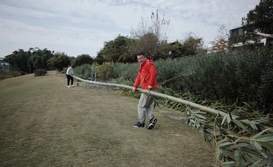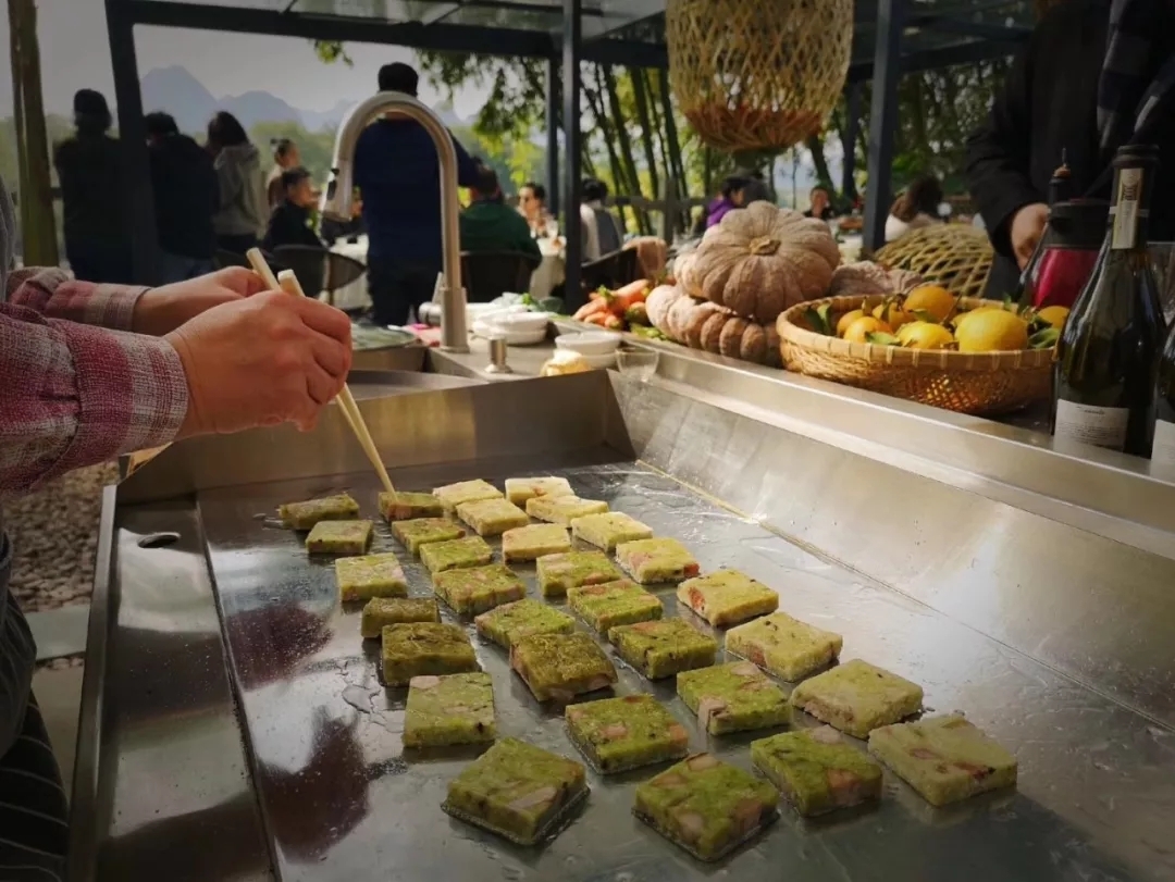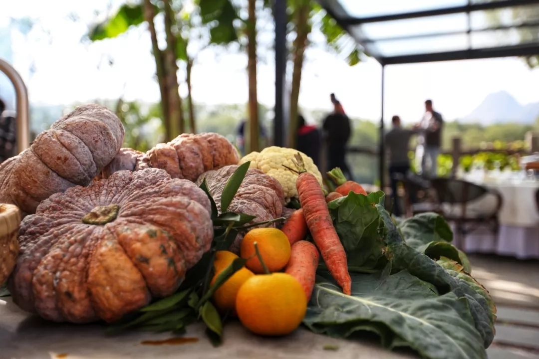 在“半亩园”有机生活体验馆,高文安先生及赴宴宾客享受与漓江零距离的田园午餐,慵懒惬意地品尝着当地、当季、现采、现做的食材,亲身体验被列为广西非物质文化遗产的——“恭城油茶”。
