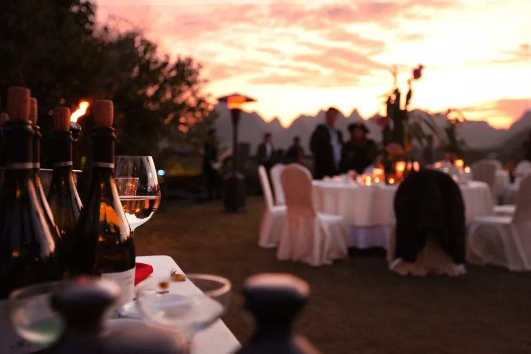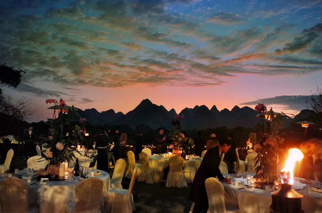 现场乐队奏响华美乐章,美酒佳肴与桂林山水相互交融,贵宾们纵享水光山色沉淀美景的轮换,诗情画意连接精神的共鸣。