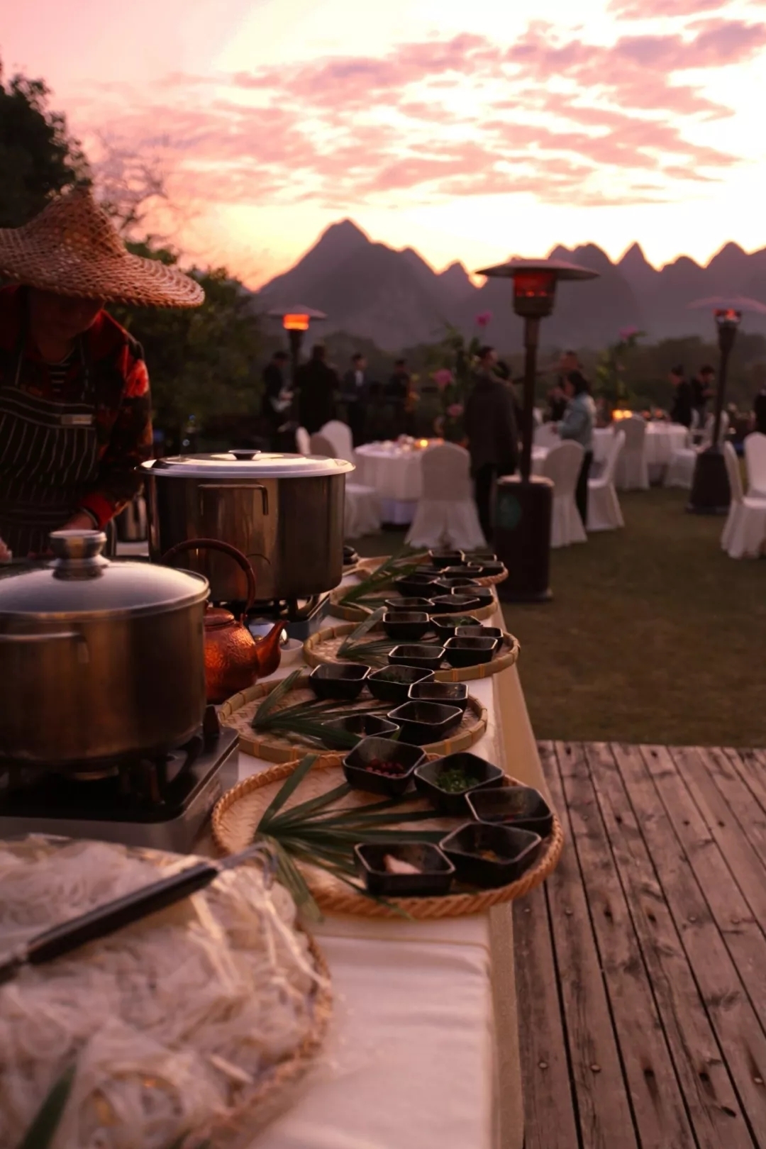 水印书院奉上最能代表桂林当地风味、最具有仪式感的定制米粉宴,并配以令人垂涎欲滴的烧烤和精致的酒水点心,用这“舌尖上的山水”给高文安先生及诸位贵宾带来惊奇的味蕾体验。