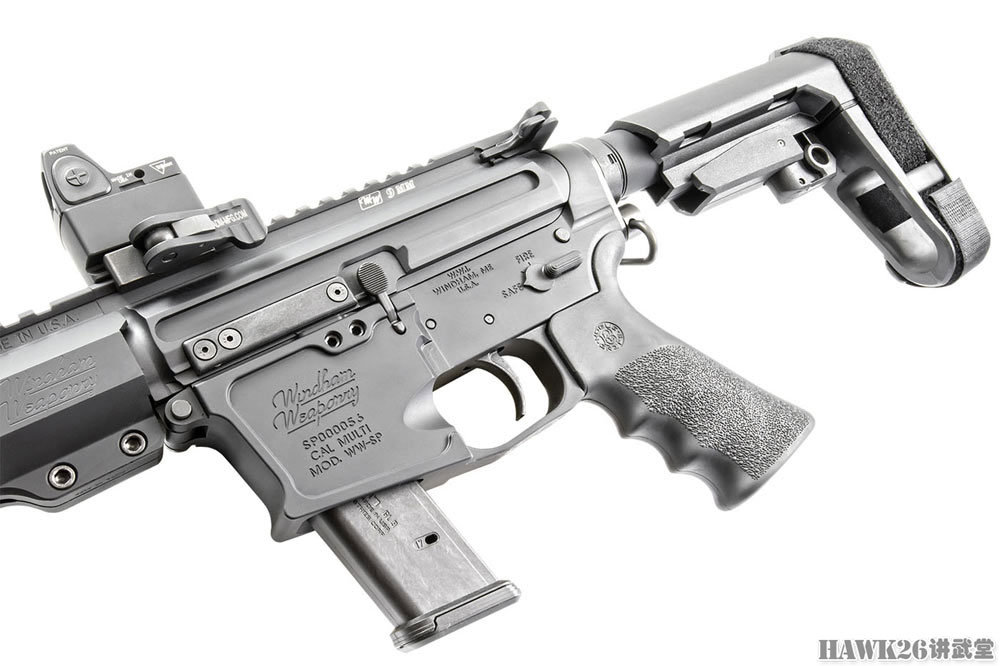 下机匣尾部,在缓冲管下方有QD枪背带插座,并配备一个QD枪背带旋转架。一体加工的扳机护圈,军标保险杆只能左侧操作,右侧只有状态标志。机匣左侧有空仓挂机解脱杆,右侧的弹匣卡笋根据手枪弹匣的不同有所改进。包裹成型的橡胶小握把和军标扳机,手感比通常遇到的要好很多。缓冲管上安装SB战术公司(SB Tactical)SBA3五档前臂支撑装置,因此这是AR手枪。