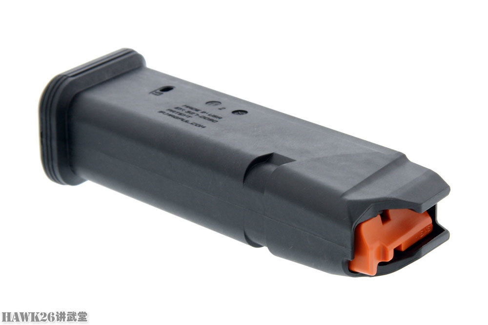 随枪附送一个Magpul PMAG 17弹匣,这种弹匣是兼容格洛克17手枪弹匣。托弹板为明亮的橙色,可以很容易通过后方的观察孔看到余弹数量。这种弹匣非常容易装填,而且可靠性非常高。GMC可以安装任何格洛克兼容的9mm弹匣,因此成为9mm格洛克手枪的最佳伴侣。你可以随时将格洛克9mm手枪弹匣装到GMC上进行射击,非常方便,而且节省了采购弹匣的费用。