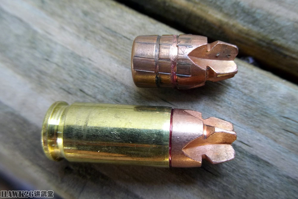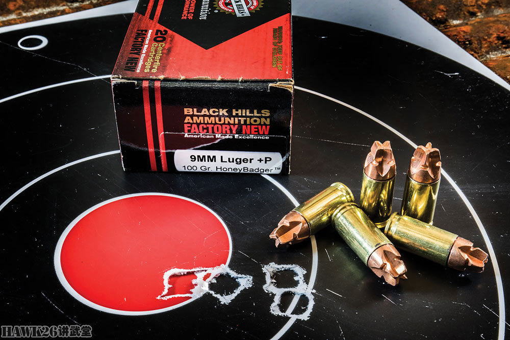 黑山100格令Honey Badger弹药的弹丸采用实心铜杆加工制作,弹尖切削出十字,穿透力非常强。击穿软目标后,会保持弹道继续向前。