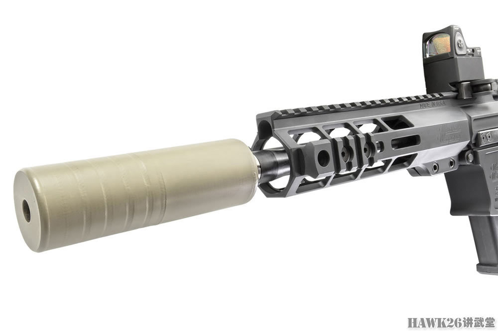 4150铬钼钒11595E钢枪管,表面Melonite QPQ黑色涂层,右旋膛线缠距1:10。枪管长229mm(9英寸),枪口有1/2×28标准螺纹,出厂时带有螺纹保护帽。测试时配备尺寸紧凑,降噪效果好的SilencerCo Omega 9K消音器。覆盖枪管的是轻量化,M-LOK通用接口铝合金护木。护木采用浮置设计,不与枪管发生接触,这样对提升精度有好处。在机匣顶部,使用ADM快速拆装(QD)镜座,安装Trijicon RM06微型红点瞄准镜进行测试。
