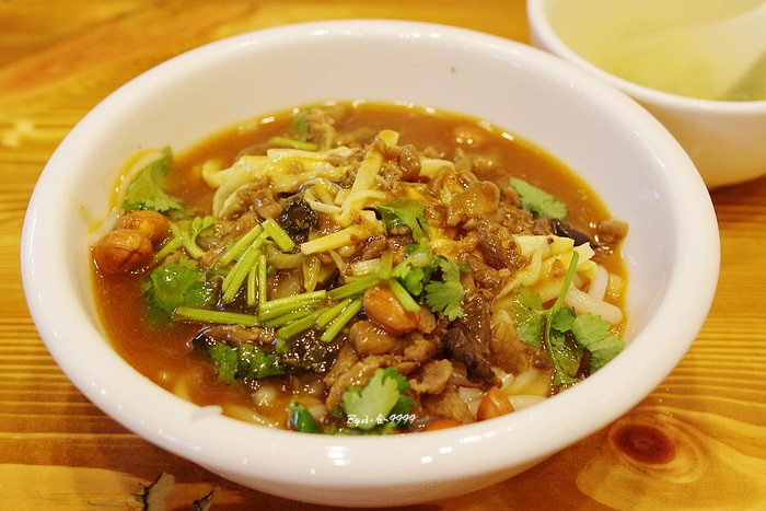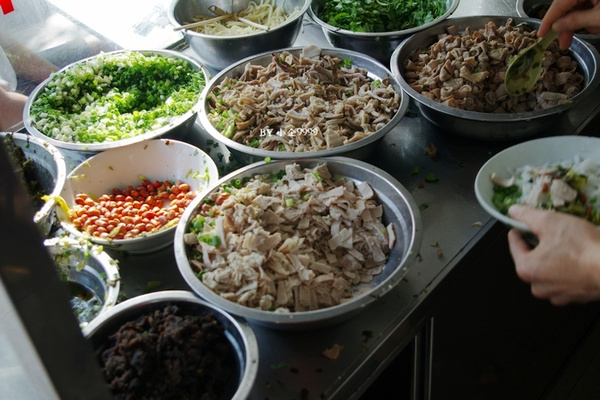 它有点像广西玉林的猪杂粉,粉烫好后,直接从柜台预先准备好的配料中按客人选点的价格加入各种东西,最后放点酸菜,芫荽,花生米,洒胡椒粉再淋上一勺勾芡过的汤汁。