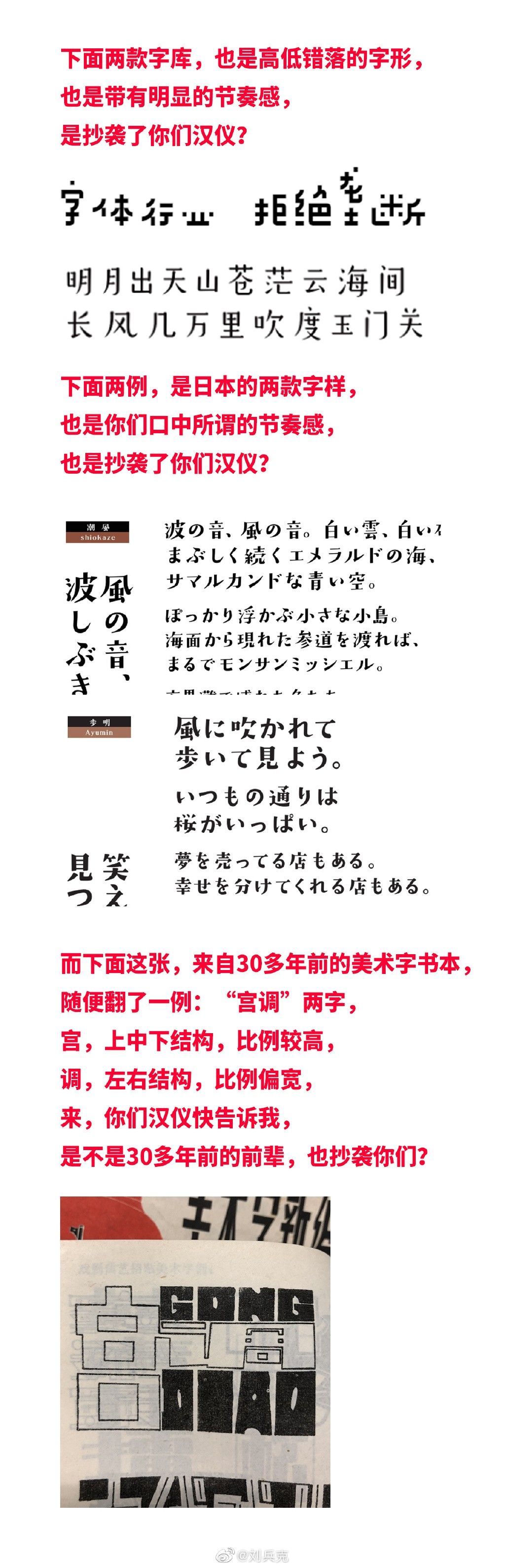 有一款来自日本的字体:DSそよ風 (DS-soyokaze), 发布在汉仪那款字体之前,也是抄袭你们汉仪的??? - 先放在一起看,是不是傻傻分不清: 你瞧,这结构,这笔画,尤其是这左低右高的节奏感! 简直一模一样了都!!动次打次的,你听到了吗? 一定是他们借了哆啦A梦的时光机过来抄袭的吧! 如果不是这款日本字体的发布时间比汉仪早, 那日本这位字体设计师真是跳到黄河都洗不清啊! - 不知道这位日本设计师是否承认使用时光机来抄袭汉仪,但是我相信汉仪高层绝对认定他们也是抄袭的!因为逻辑和我的这款字一样,主观上觉得长得像就是抄!惹我不开心就是抄!管你有没有时光机! - 除了日本这款,还有更多实锤! 下面这2款字体,别说专业的设计师,只要不是眼瞎,就连街边的阿姨大伯都能看得出是抄着做的,但是汉仪肯定不会这么想,毕竟是自家的字,汉仪的字是天下无双,只能让众人跪拜和模仿,怎么可能抄袭别人呢?对吧?! 哈哈哈哈,不知道大家笑了没有,反正我在做这个图的时候,是一边做一边笑…… 所以…… 汉仪的意思就是,我觉得你的字体有点像我的,肯定是抄我的。 汉仪的字体像别家的,那。 。 。 读书人的事,能算抄吗? |
