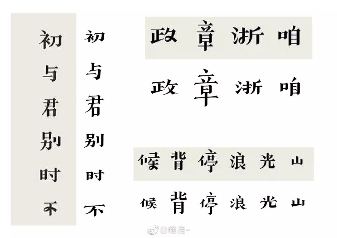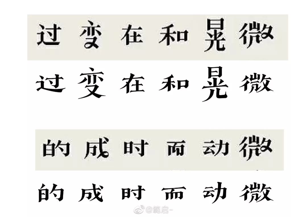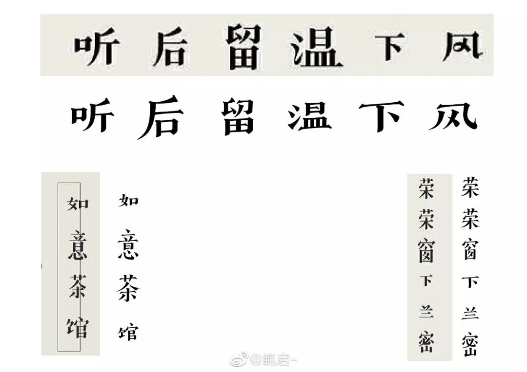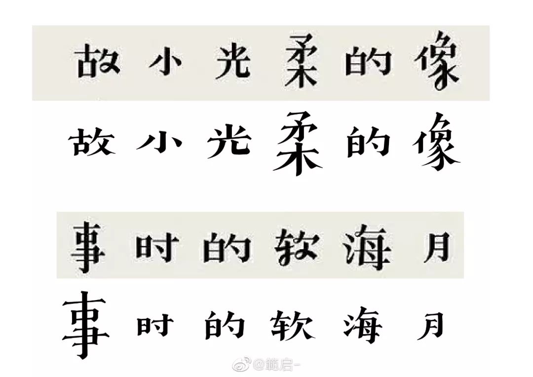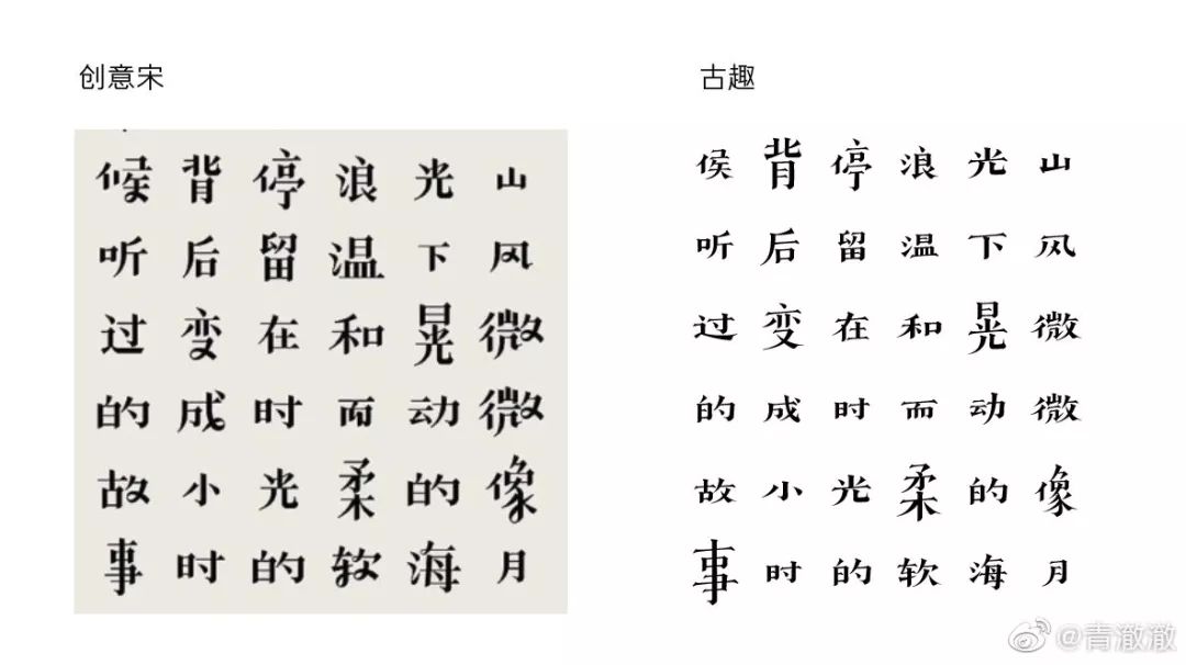 @赵大方方方方方:“那么多相似的黑体宋体,到底谁抄谁的?”这句话让我很意外,字体的间架结构就像是骨骼,像黑体这种正文字结构稍微有一点变化,性格就会发生质的区别,黑宋体的研发被你一句话就否定了。而美术字重在创意,古趣对于字形结构突破常规的变化正是其创意所在,两款字高低胖瘦结构相近,排列对比显而易见。