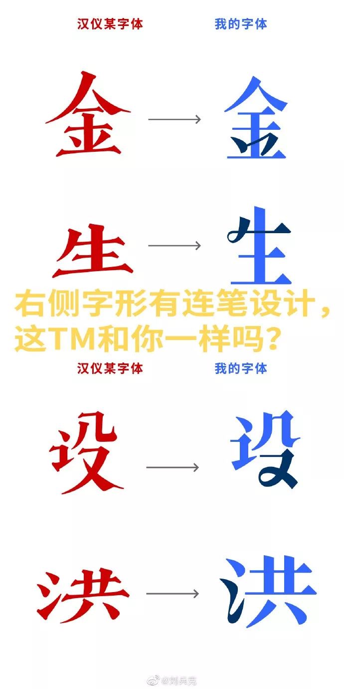 刘兵克在公号上和微博上都列出了笔划细节对比、整体对比、重叠对比,并表示:这TM和你一样吗?