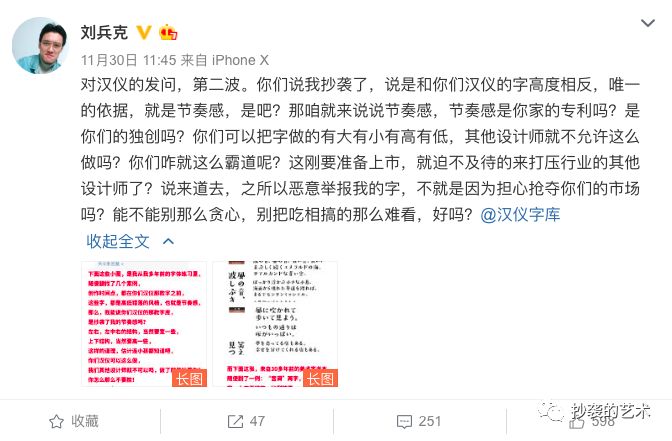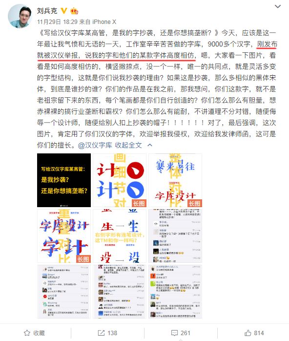 除此之外,刘兵克在微博长篇怒怼汉仪字库X高管,称是他抄袭,还是汉仪搞垄断?原文如下: