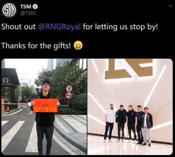 在转会期,世界各大赛区的战队也是往来频繁。作为各自赛区的常年强队之一,北美豪门TSM就到LPL赛区RNG基地进行了参观,其官推放出了队员们参观RNG基地的照片,并对收到RNG送的礼物表示了感谢。不难看出,TSM的队员此行是相当放松与高兴的。
