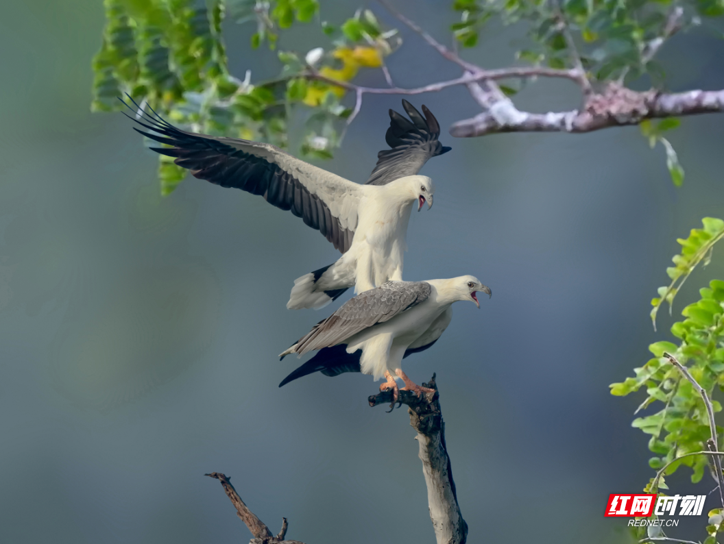 两只白腹海雕在树干上嬉戏玩耍,口中不时发出“啊、啊”的叫声。余敏/摄