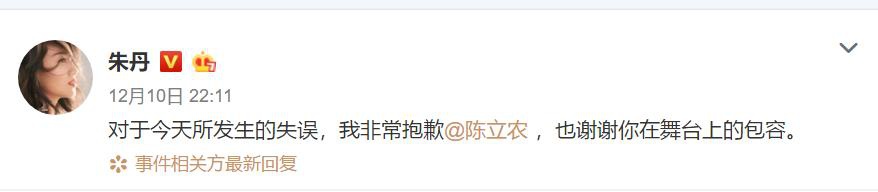 在活动结束后,朱丹很显然意识到了自己的错误。于是赶紧上网发道歉文来弥补,并手动艾特了陈立农本人。乖巧的陈立农也立马回复,说自己还是新人,会继续努力让朱丹记住自己的。