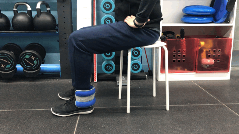 坐位,于一侧小腿远端绑一沙袋,双手叉腰稳定躯干,略往后弯腰,吸气时缓慢使脚抬起离开地面,呼气时缓慢落下,10次/组。