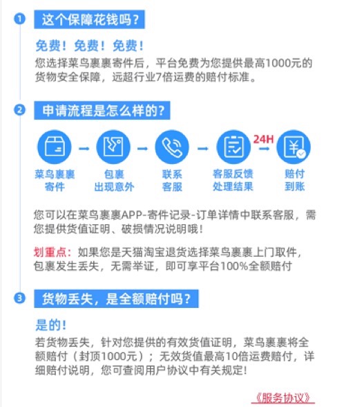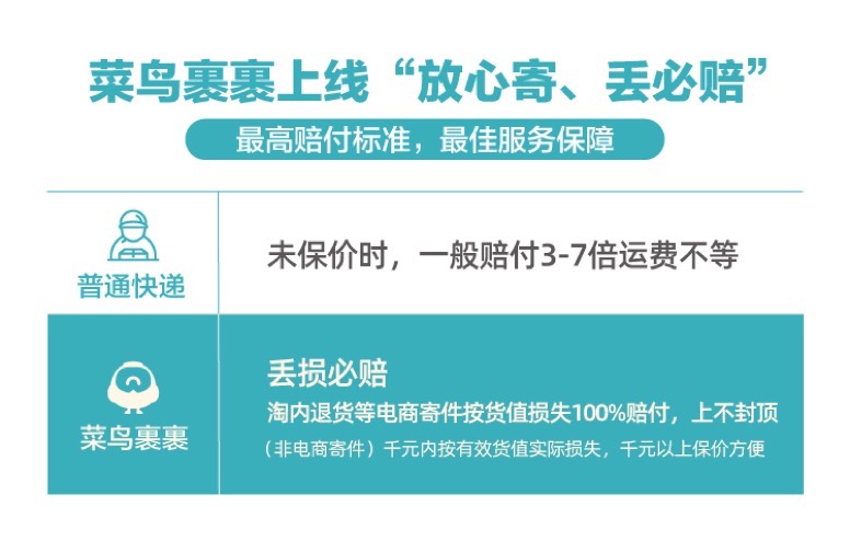 菜鸟方面称,随着“放心寄”推出,淘系内退货、二手交易等寄件可享受丢、损必赔服务,退货免举证,快速赔付最快24小时到账。而在非电商场景下,用户使用菜鸟裹裹寄快递,也享有业内最高赔付标准:千元内“放心寄”,按有效货值丢损必赔;千元以上则可方便保价,超出一般快递数百元不等的封顶。